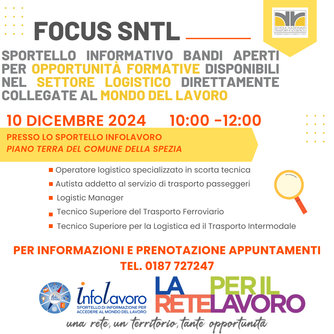 10 dicembre 2024 ore 10,00 - Nuovo Appuntamento informativoc/o INFOLAVORO - FOCUS BANDI ED OPPORTUNITA' FORMATIVE DISPONIBILI -SCUOLA NAZIONALE TRASPORTI